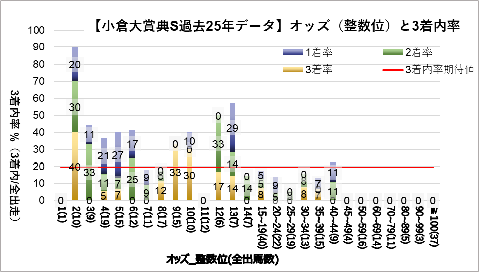 - 2.0~2.9倍(複勝率90.0%)、3.0~3.9倍(複勝率44.4%)、4.0~4.9倍(複勝率36.8%)、5.0~5.9倍(複勝率40.0%)、6.0~6.9倍(複勝率41.7%)、12.0~12.9倍(複勝率50.0%)、13.0~13.9倍(複勝率57.1%)
