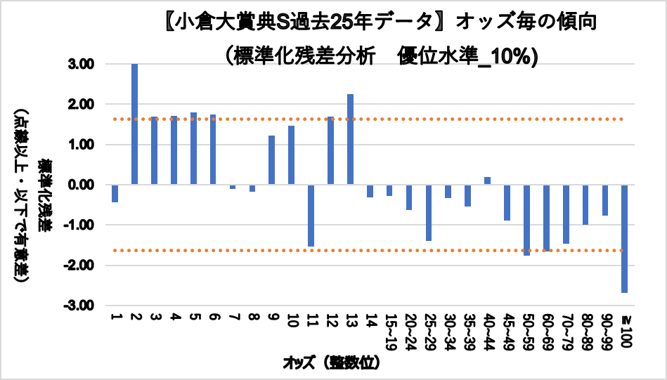 一方、50.0~69.9倍、100倍以上は統計的に見ても有意に凡走傾向である。