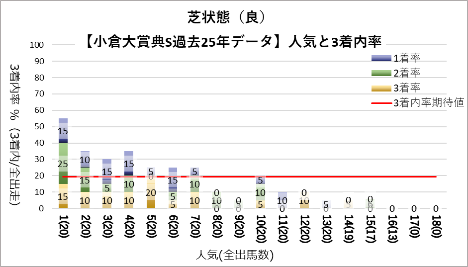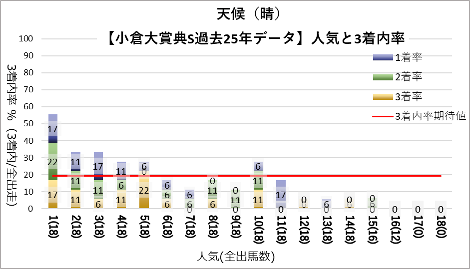 良好条件(晴・良芝)では1人気が圧倒的に好成績を残している。