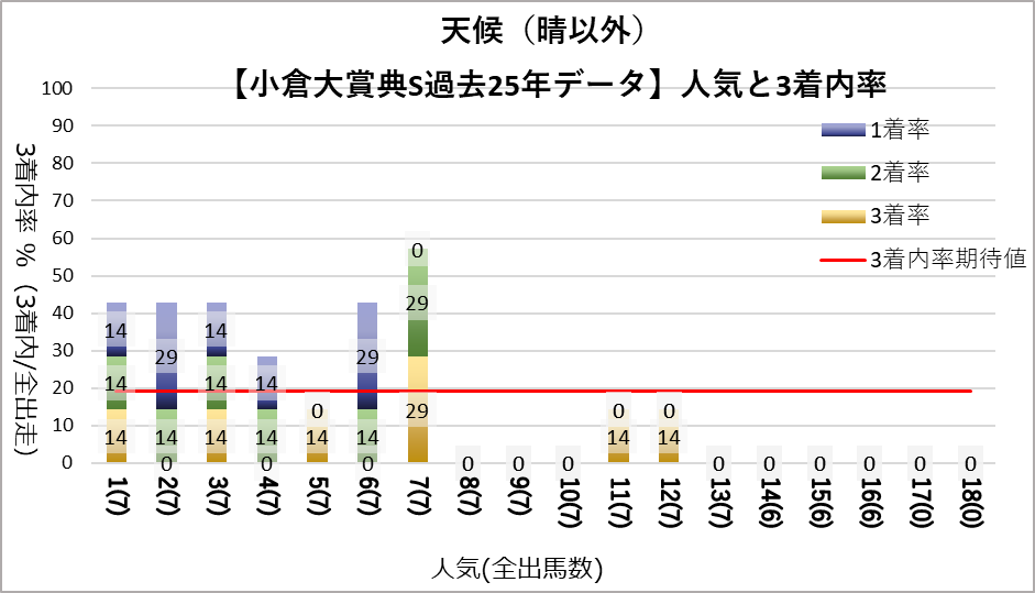 一方晴以外の天候では、7人気までが平均以上の成績を残している。