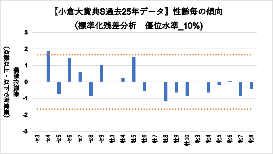セン馬4歳(複勝率100%)に統計的有意差が認められ、平均複勝率(19%)よりも好走する傾向が見られた。※出走数注意