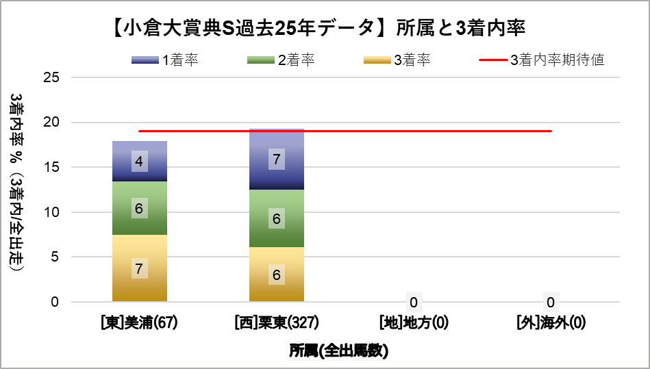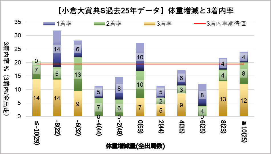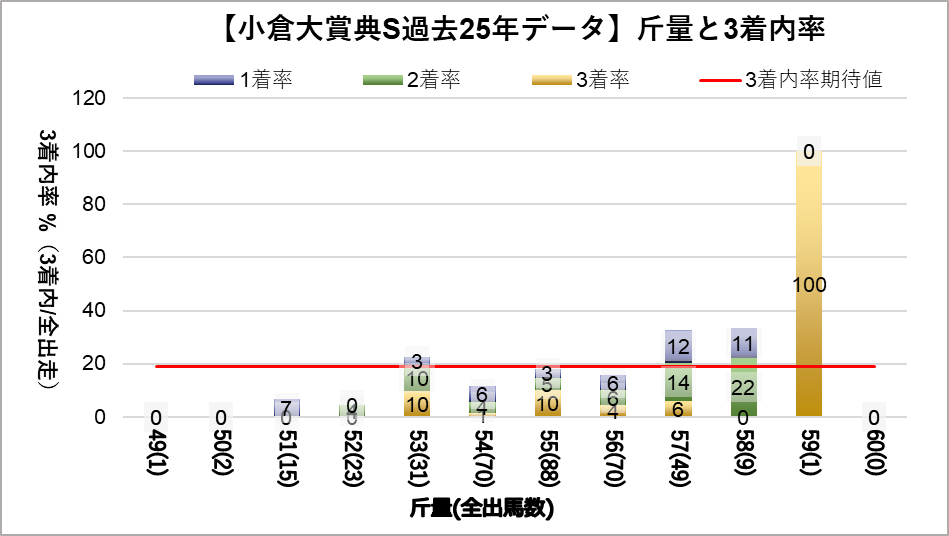 斤量57kg(複勝率32.7%)と斤量59kg(複勝率100%)に統計的有意差が認められ、平均複勝率(19%)よりも好走する傾向が見られた。