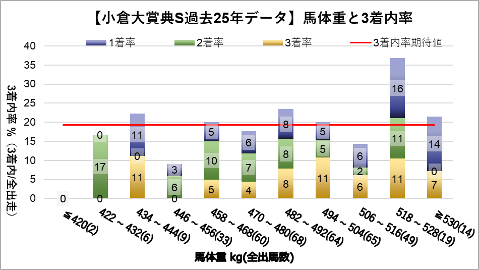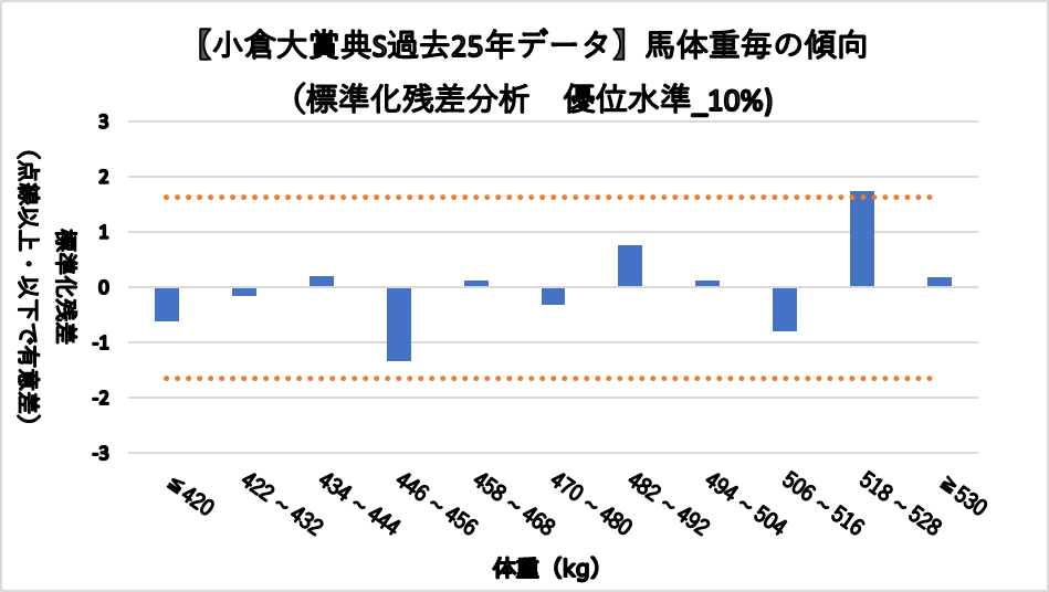 馬体重518~k528gレンジ(複勝率36.8%)において、統計的有意差が認められ、平均複勝率(19%)よりも好走する傾向が見られた