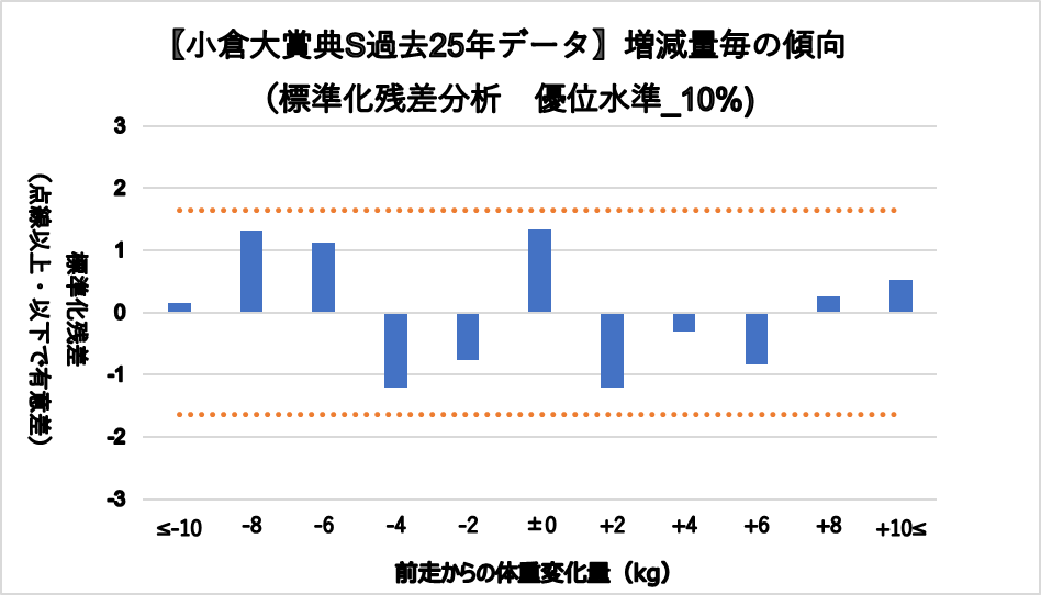 増減量-4kgと増減量+2kgは凡走する傾向が見られたが、統計的な有意差は認められなかった。