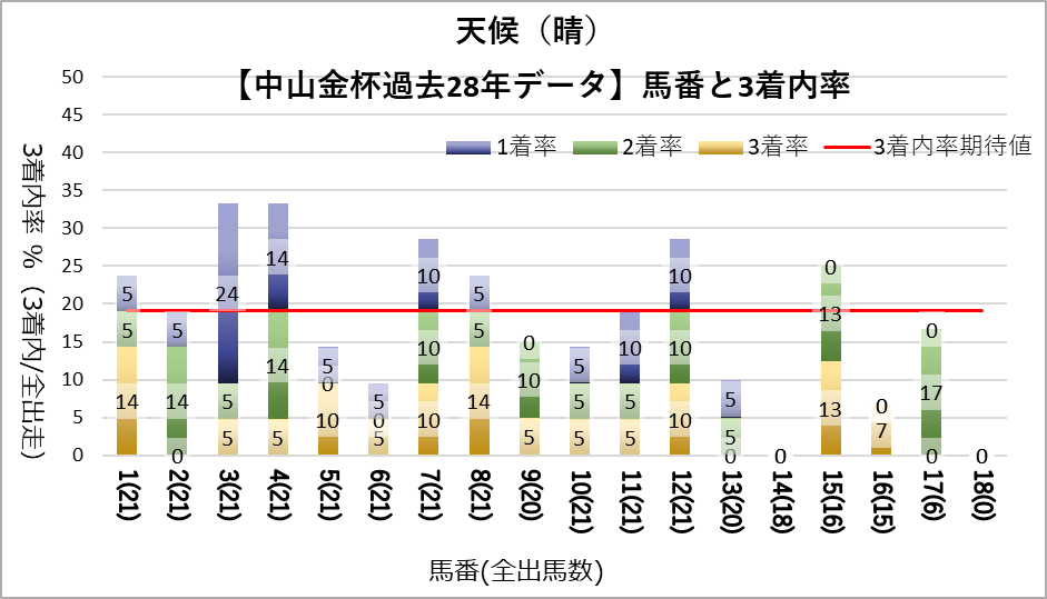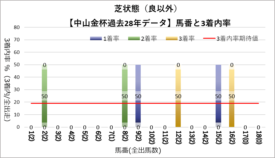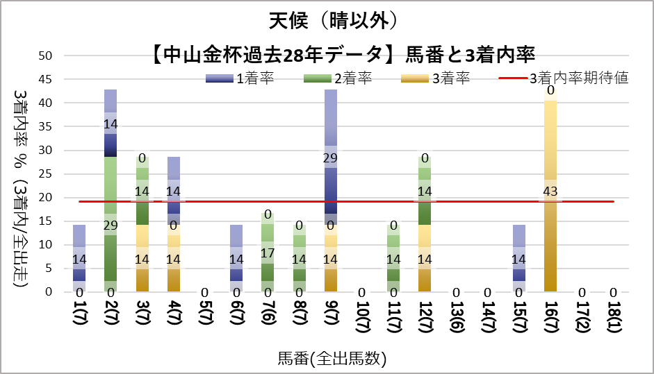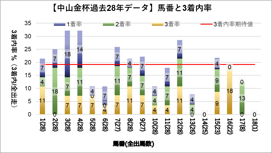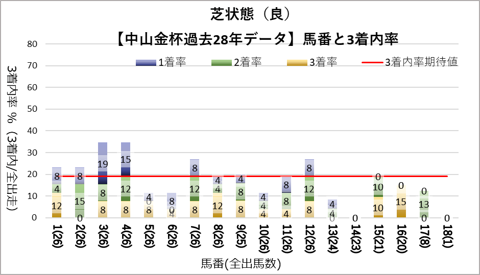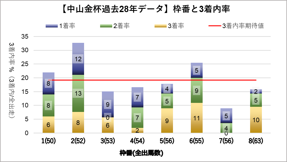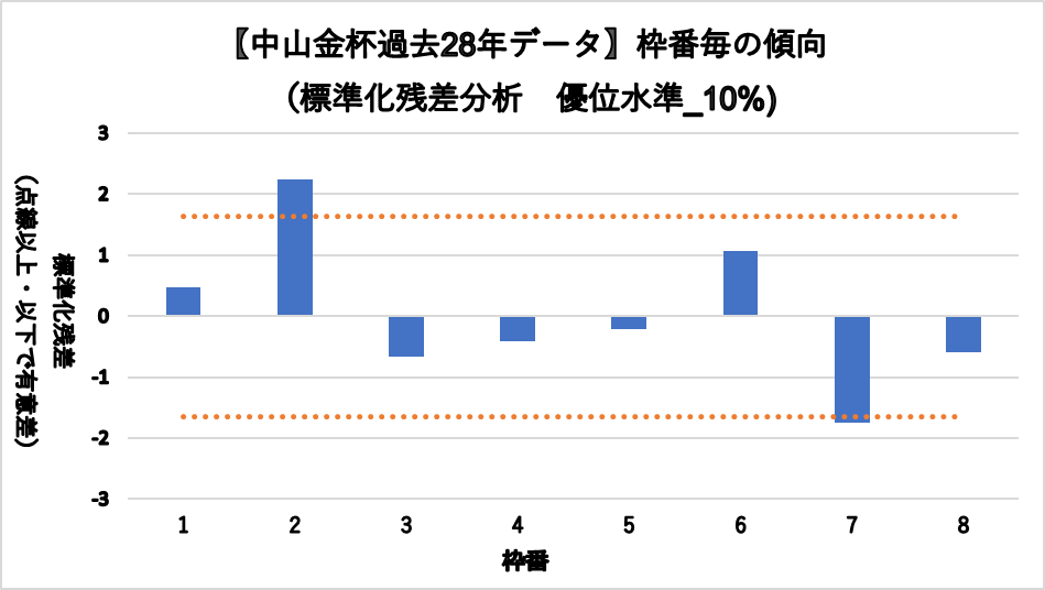 2枠(複勝率32.7%)についてのみ統計的有意差が認められ、平均複勝率(19%)よりも好走する傾向が見られた。