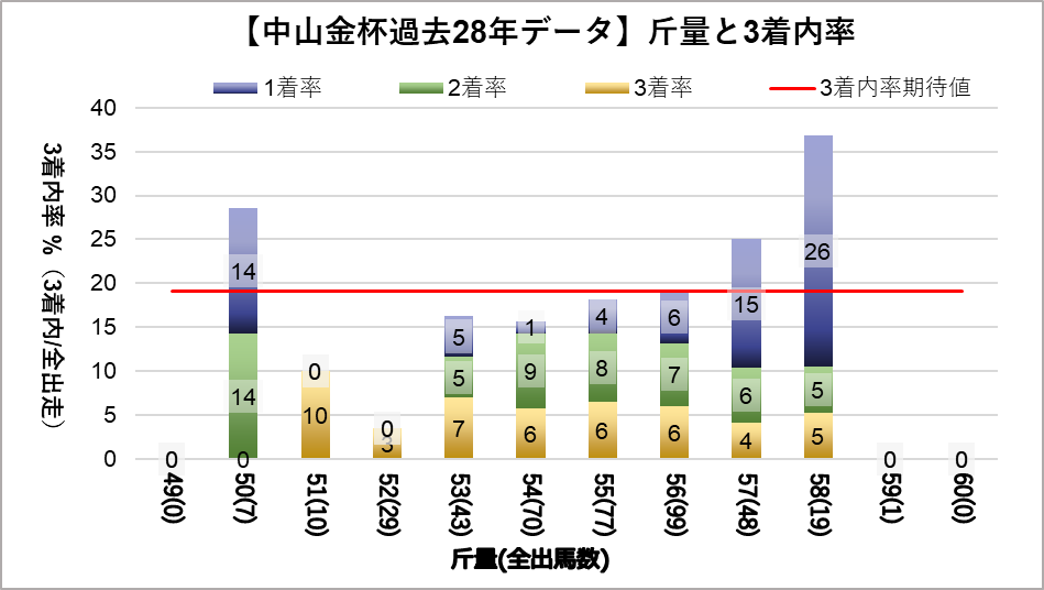 斤量58kg(複勝率36.8%)に統計的有意差が認められ、平均複勝率(19%)よりも好走する傾向が見られた。