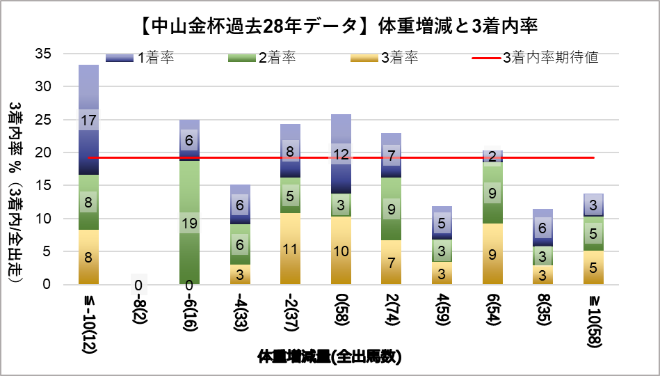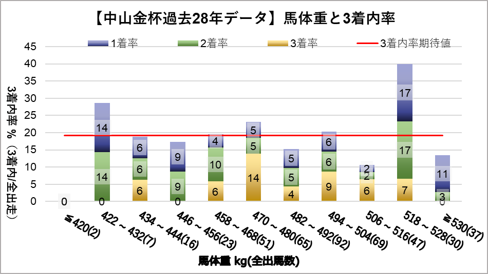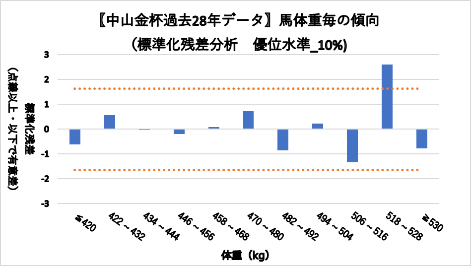 馬体重518~528kgレンジ(複勝率40.0%)において、統計的有意差が認められ、平均複勝率(19%)よりも好走する傾向が見られた