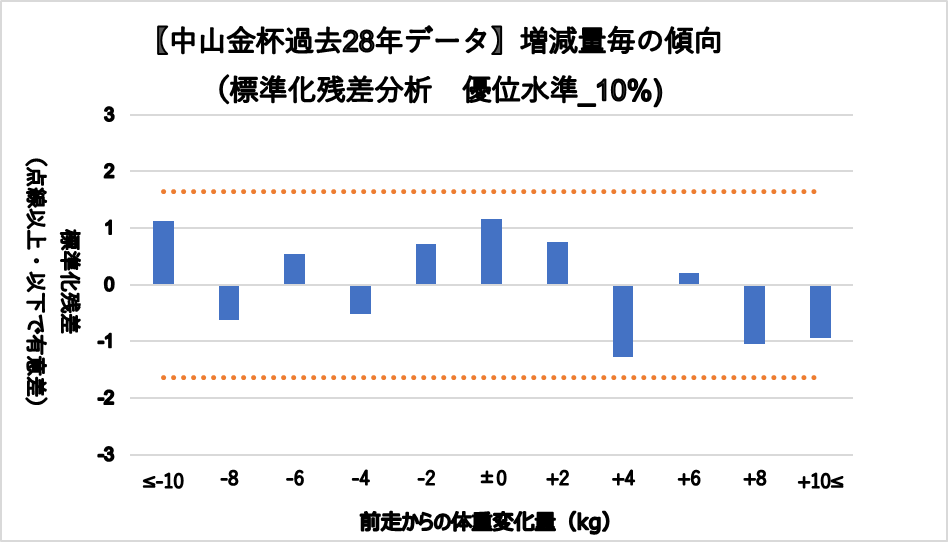 増減量-10kg以上が最も好走しているが統計的な有意差は認められなかった。