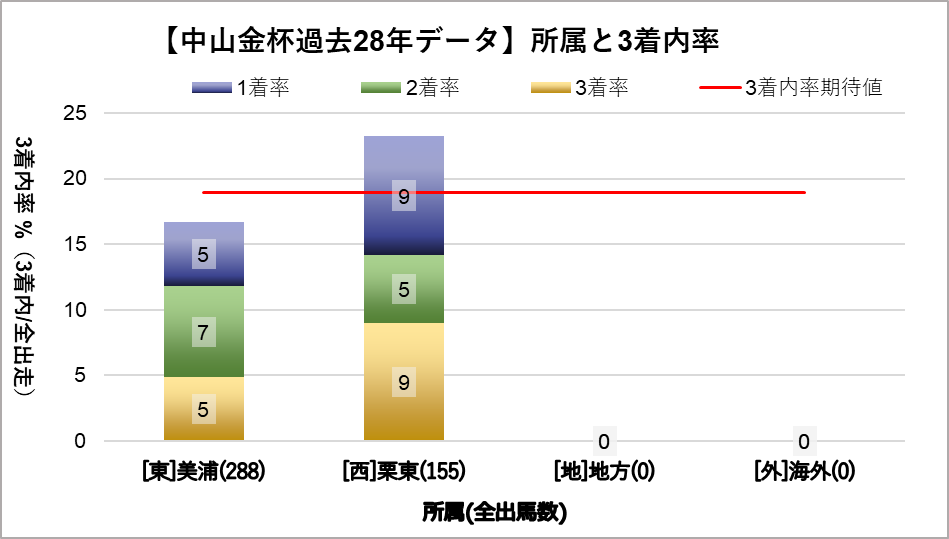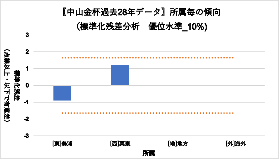 栗東所属の方が好走傾向ではあるものの、統計的な有意差は認められなかった。