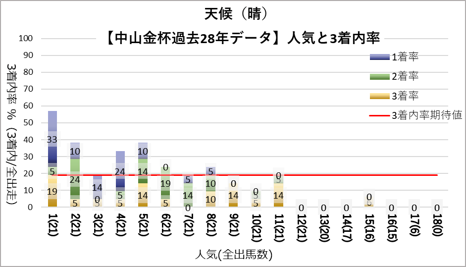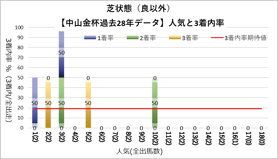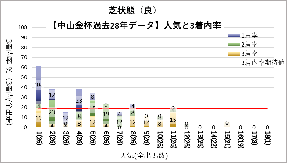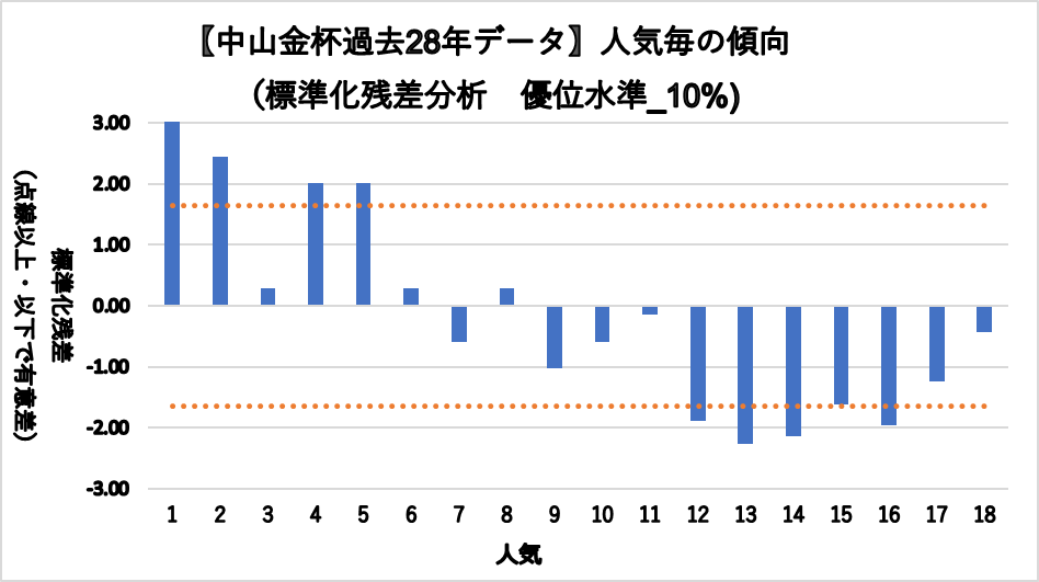 1人気(複勝率60.7%)、2人気(複勝率39.3%)、4人気(複勝率35.7%)、これらの人気に統計的有意差が認められ、平均複勝率(19%)よりも好走する傾向が見られた。