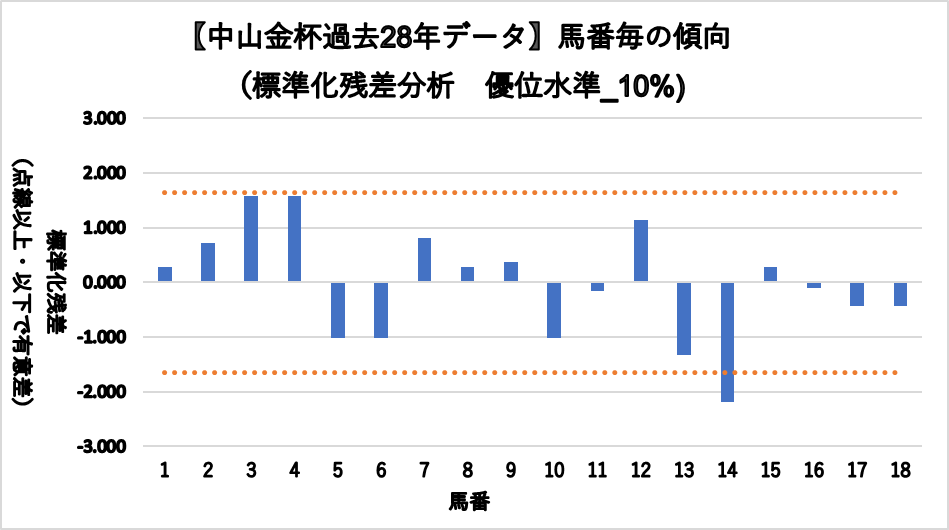 統計的に有意差があった項目について、3着内率グラフと統計処理(標準残差分析)グラフの2つを掲載しています。