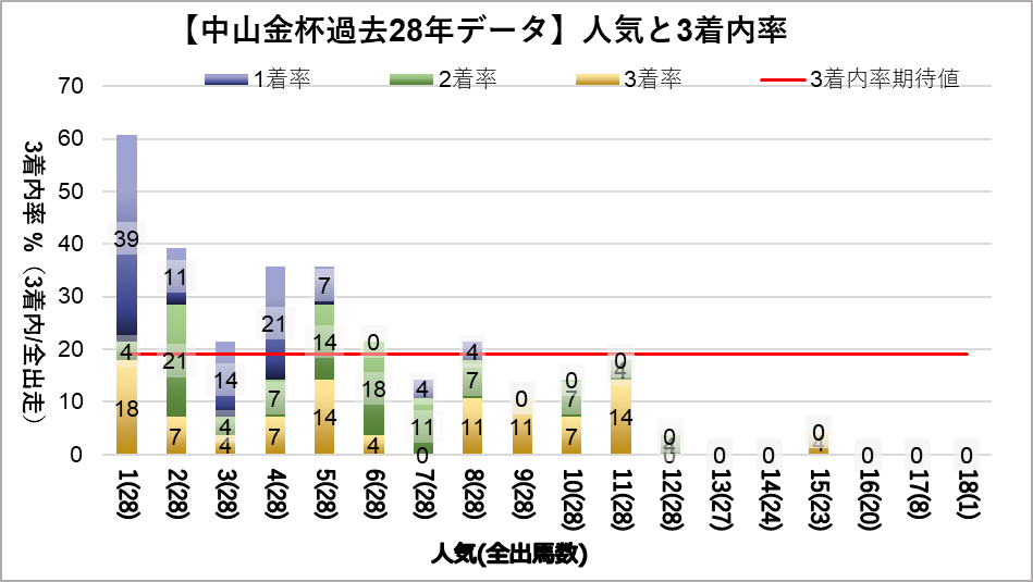 - 1人気(複勝率60.7%)、2人気(複勝率39.3%)、4人気(複勝率35.7%)