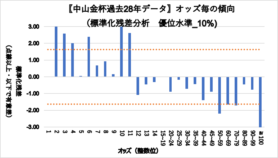 2.0~2.9倍(複勝率88.9%)、3.0~3.9倍(複勝率50.0%)、4.0~4.9倍(複勝率37.5%)、6.0~6.9倍(複勝率50.0%)、10.0~10.9倍(複勝率56.3%)、11.0~11.9倍(複勝率66.7%)、これらのオッズ帯に統計的有意差が認められ、平均複勝率(19%)よりも好走する傾向が見られた。