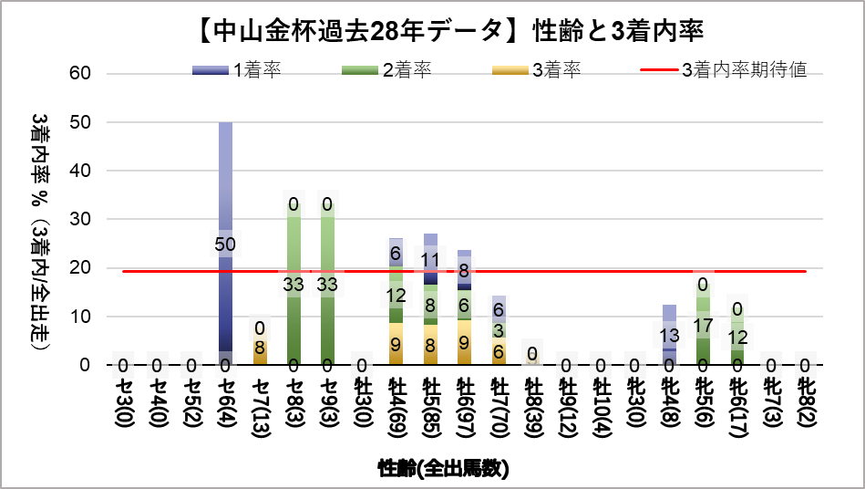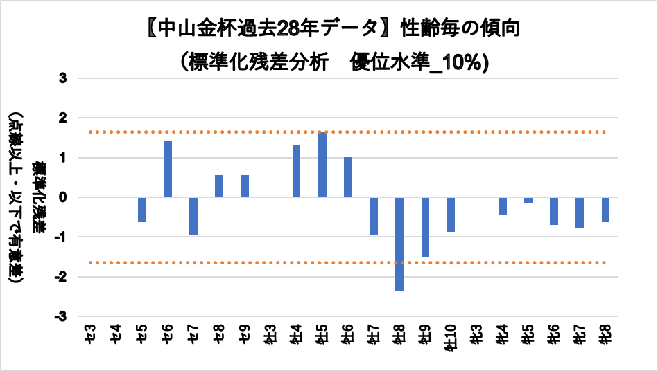 牡5歳馬(複勝率27.1%)に統計的有意差が認められ、平均複勝率(19%)よりも好走する傾向が見られた。
