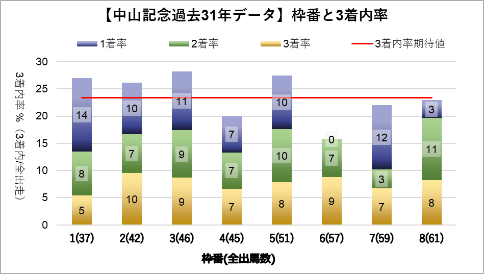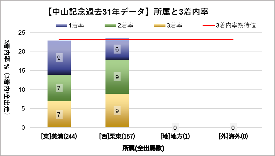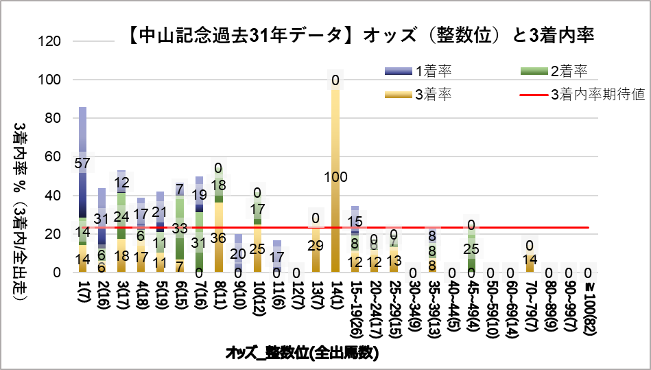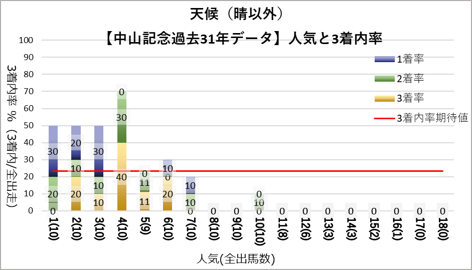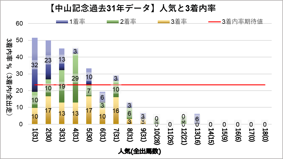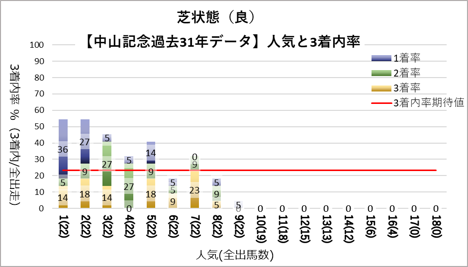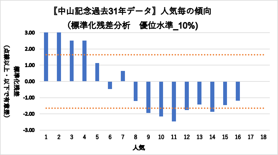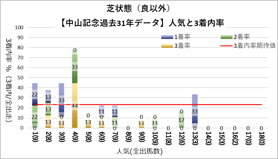 1人気(複勝率51.6%)、2人気(複勝率50.0%)、3人気(複勝率45.2%)、4人気(複勝率45.2%)これらの人気に統計的有意差が認められ、平均複勝率(23%)よりも好走する傾向が見られた。