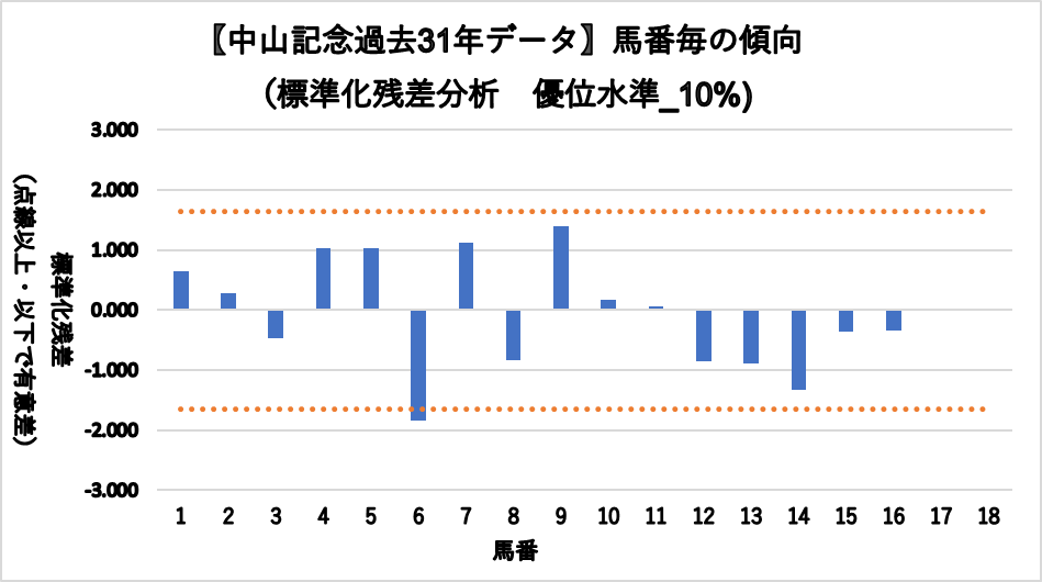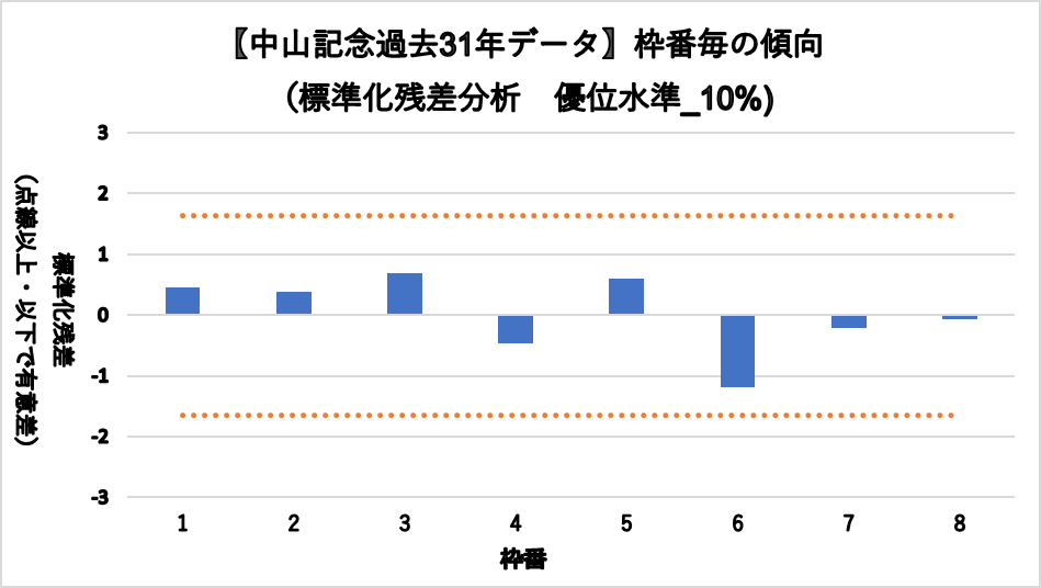 統計的に有意差があった項目について、3着内率グラフと統計処理(標準残差分析)グラフの2つを掲載しています。
