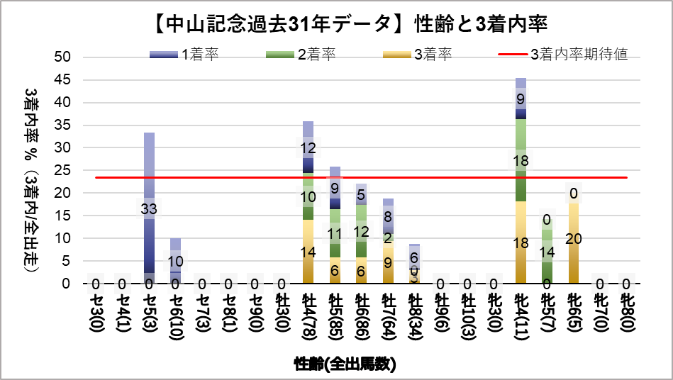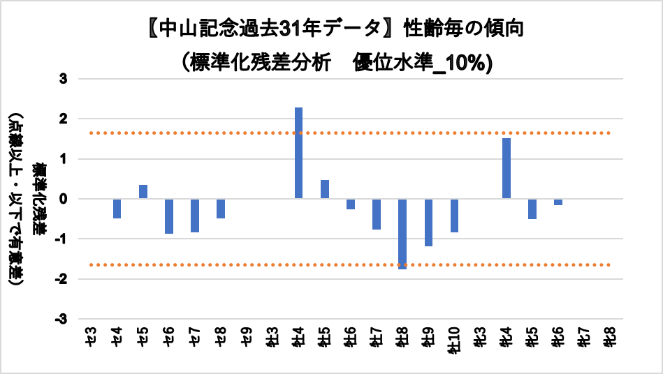 牡馬4歳(複勝率35.9%)に統計的有意差が認められ、平均複勝率(23%)よりも好走する傾向が見られた。