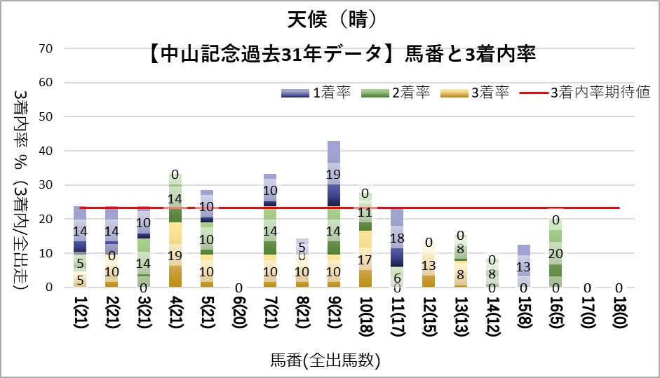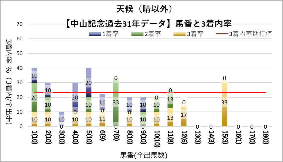 統計処理グラフでは3着内に入りやすい条件と入りにくい条件がわかります。軸馬の選定や消し馬の判別にご利用ください。