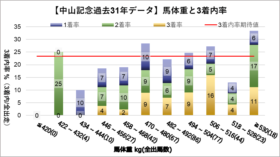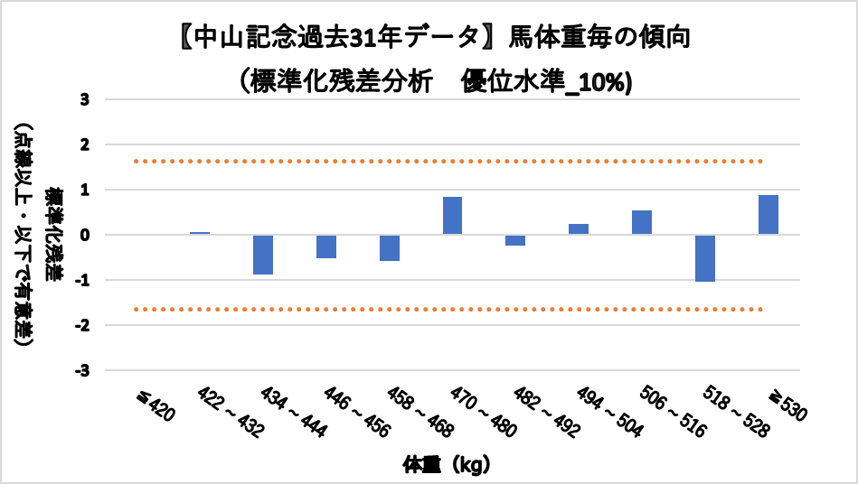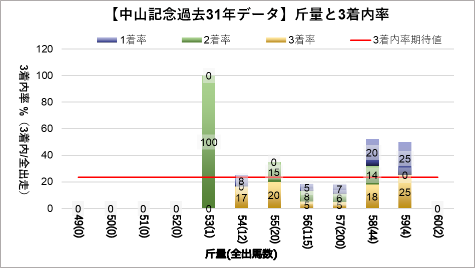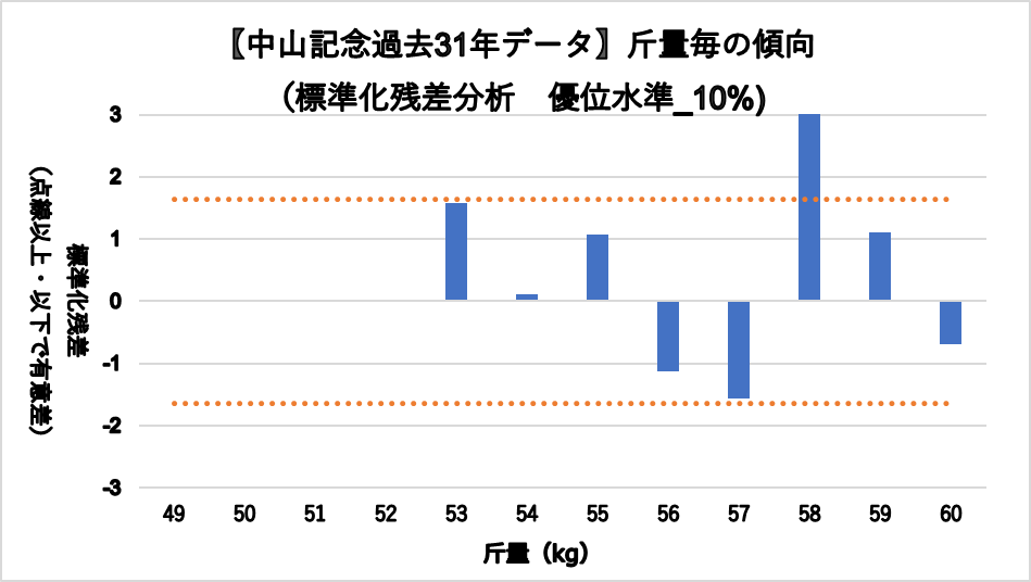 斤量58kg(複勝率52.3%)に統計的有意差が認められ、平均複勝率(23%)よりも好走する傾向が見られた。