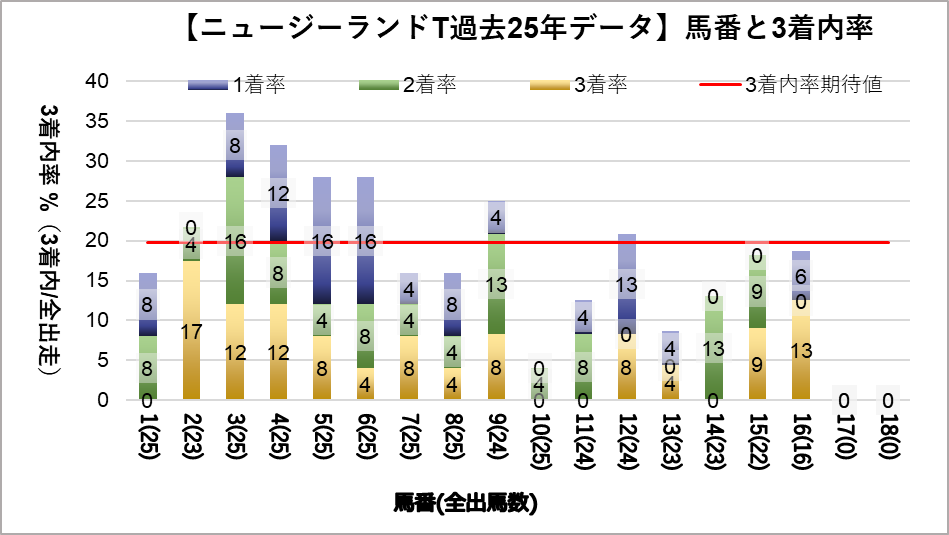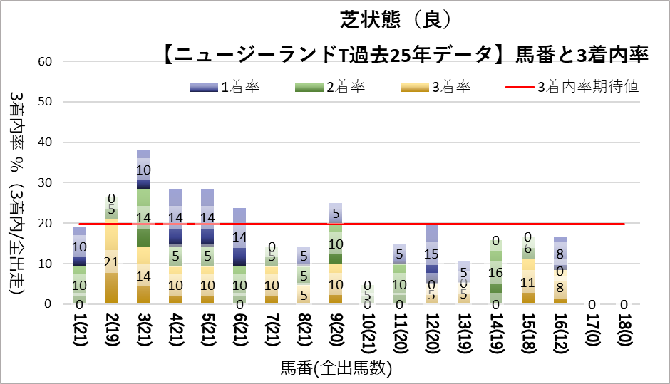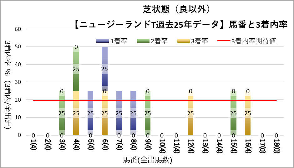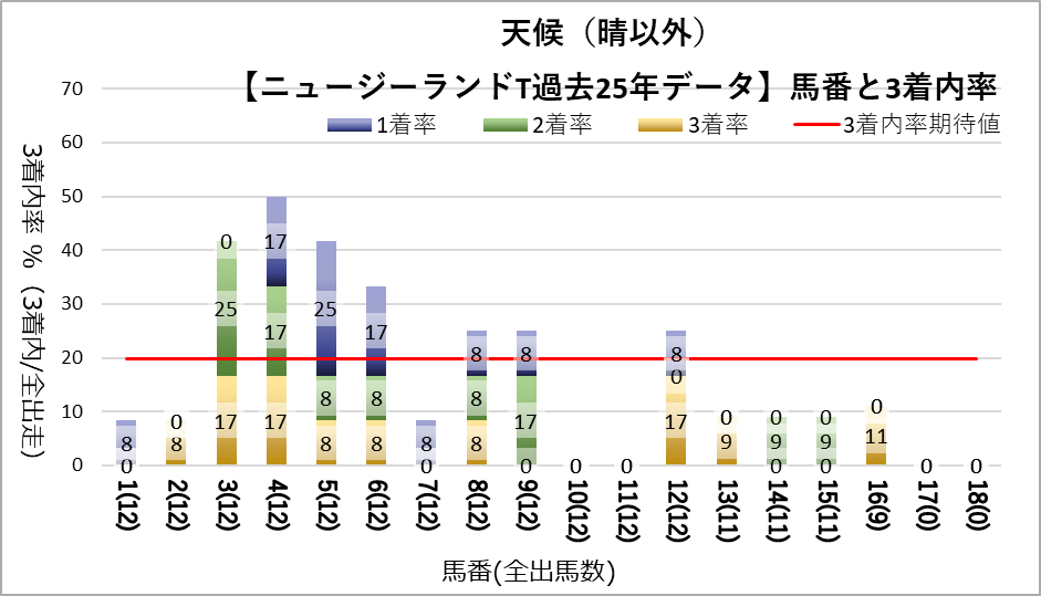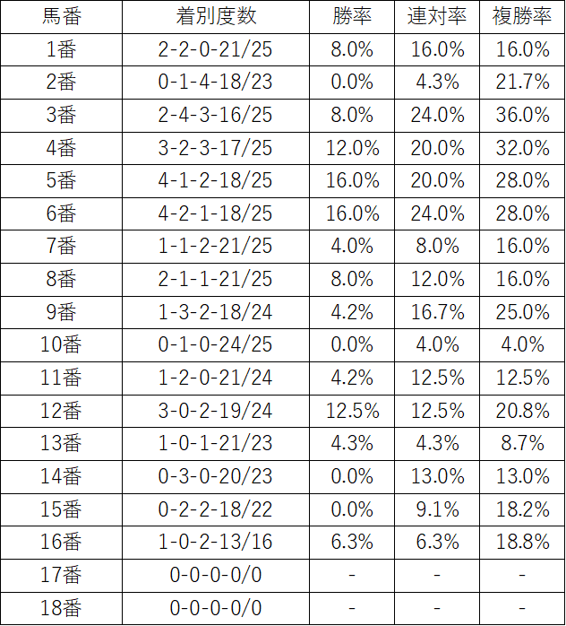 一方、4番は悪条件のとき好走しやすい傾向があり、悪条件下であればトップの複勝率を誇る。