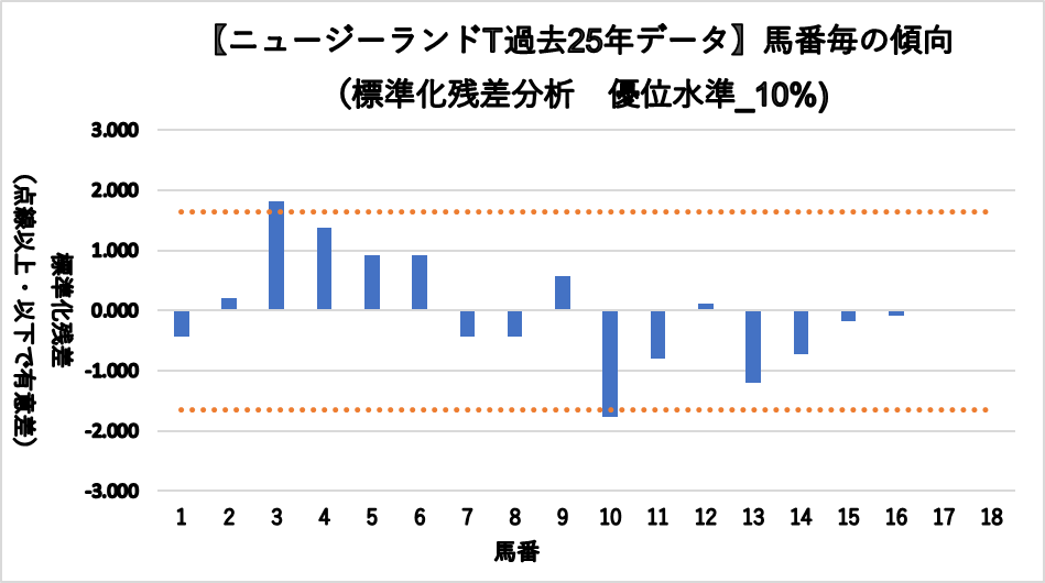 3番(複勝率36.0%)についてのみ統計的有意差が認められ、平均複勝率(20%)よりも好走する傾向が見られた。