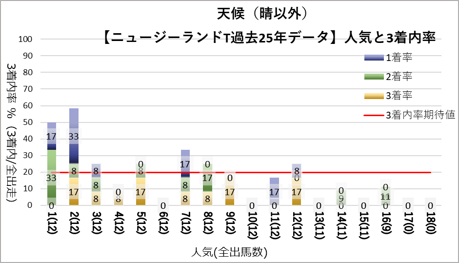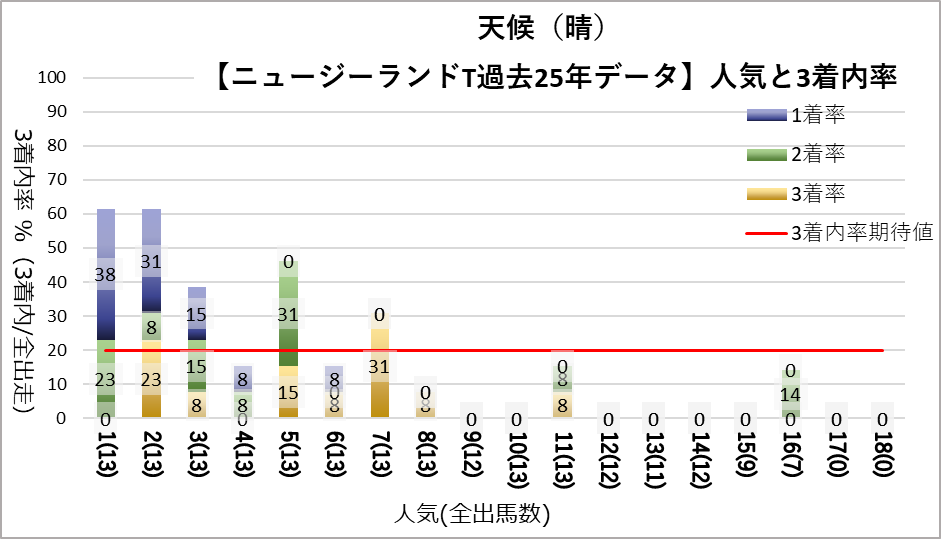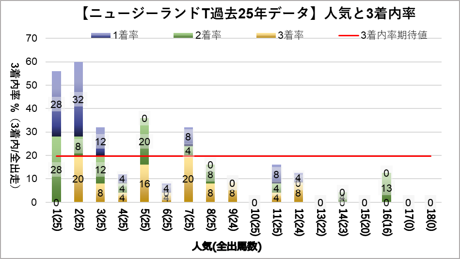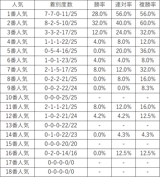 - 1人気(複勝率56.0%)、2人気(複勝率60.0%)、5人気(複勝率32.0%)