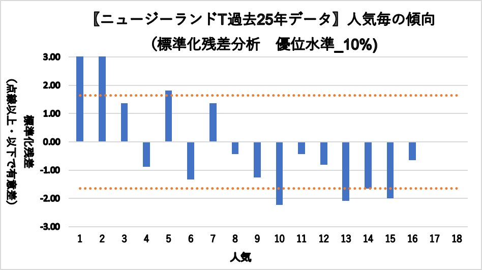 一方、10, 13, 14, 15人気においては有意に凡走する傾向が見られた。