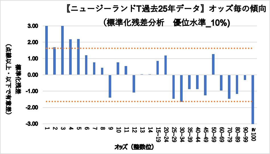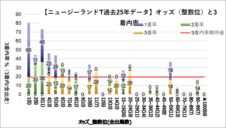 オッズ1.0~1.9倍(複勝率80.0%)、2.0~2.9倍(複勝率44.4%)、3.0~3.9倍(複勝率81.8%)、4.0~4.9倍(複勝率46.2%)、5.0~5.9倍(複勝率43.8%)これらのオッズ帯に統計的有意差が認められ、平均複勝率(20%)よりも好走する傾向が見られた。