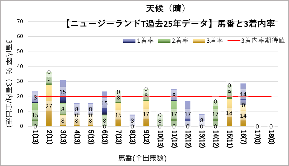 3番はどの条件下でも期待値以上の複勝率を記録しているが、悪条件(晴以外、良以外)では一度も勝利が無いことに注意が必要。
