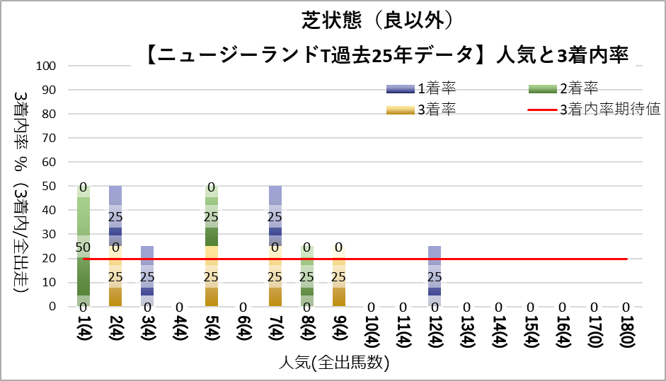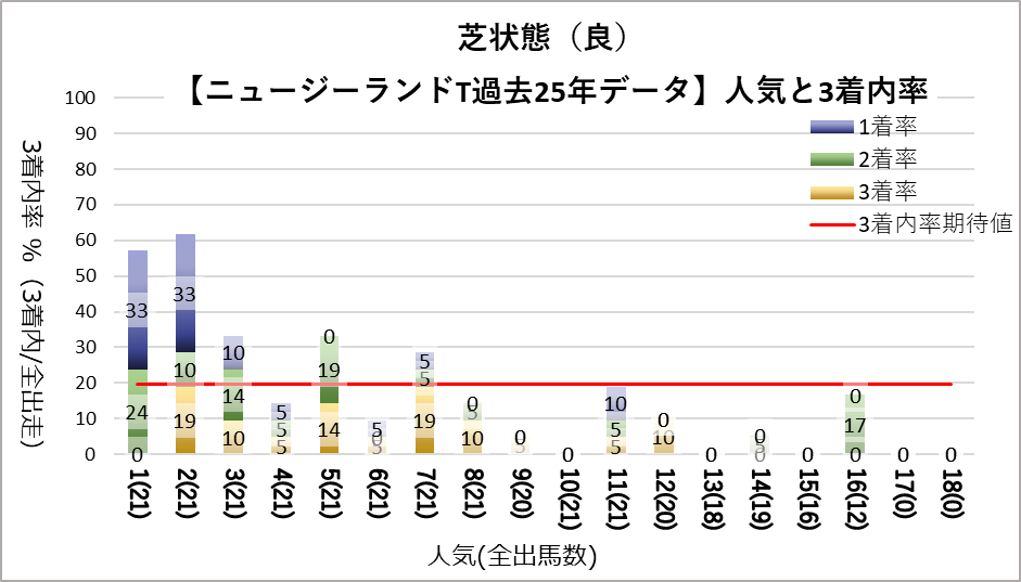 1人気(複勝率56.0%)、2人気(複勝率60.0%)、5人気(複勝率32.0%)これらの人気に統計的有意差が認められ、平均複勝率(20%)よりも好走する傾向が見られた。