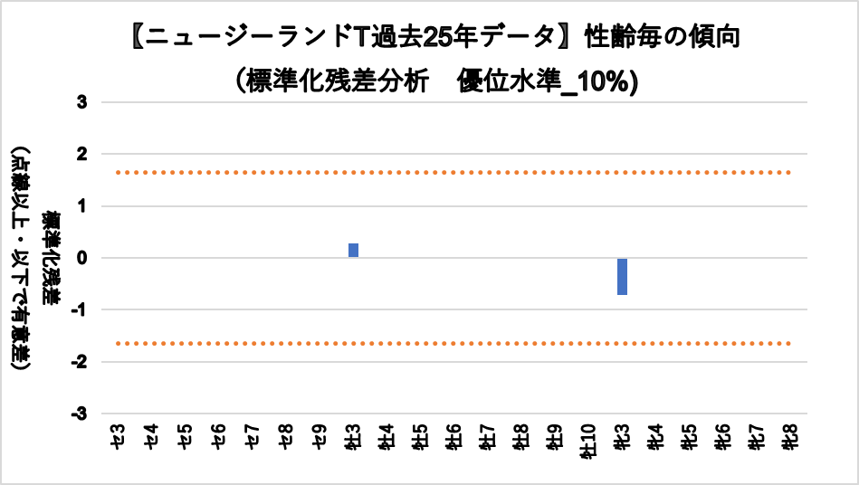 統計的に有意差があった項目について、3着内率グラフと統計処理(標準残差分析)グラフの2つを掲載しています。