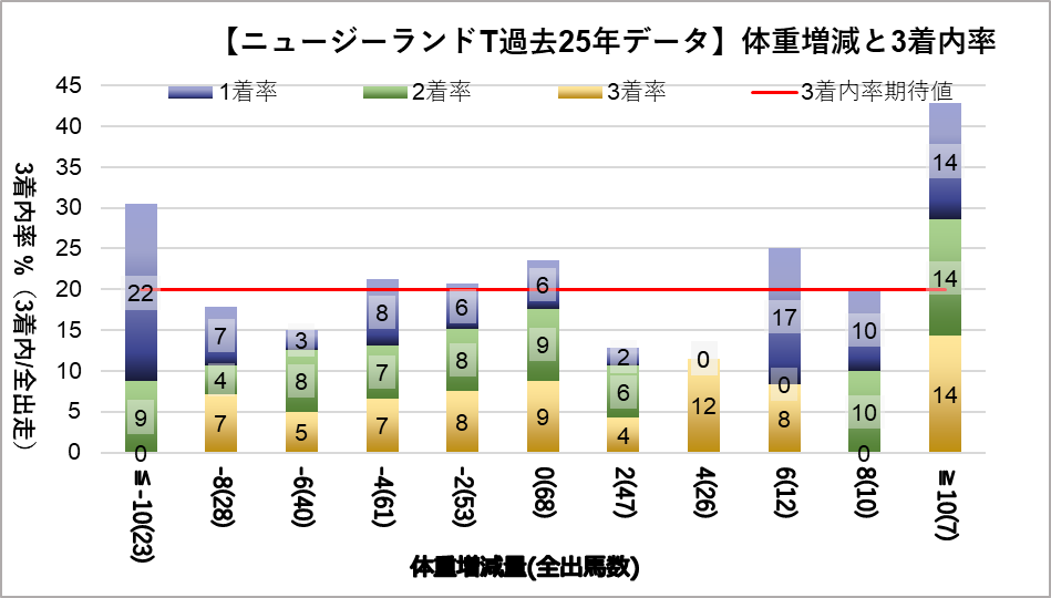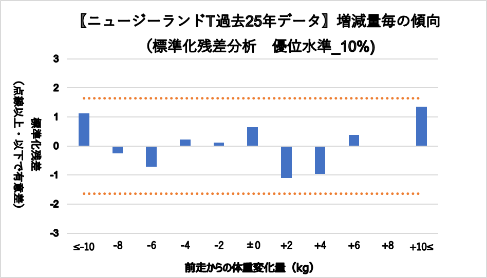 増減量±10kg以上に好走の傾向がみられるが、統計的な有意差は認められなかった。