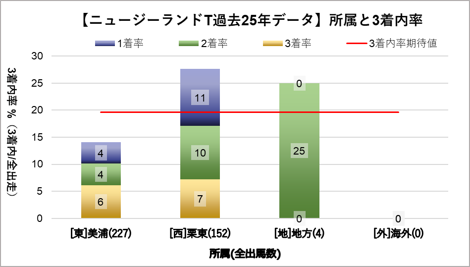 美穂所属(複勝率14.1%)が比較的馬券に絡みにくい傾向が見られた。