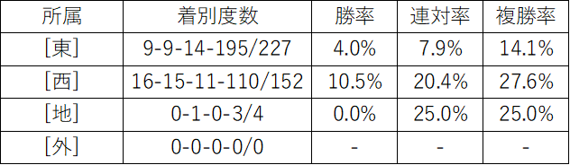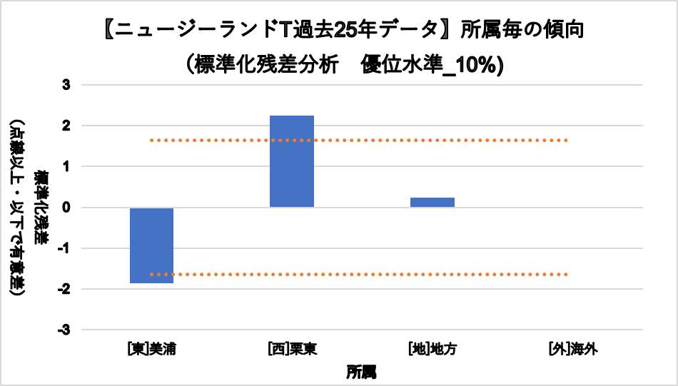 栗東(西)所属(複勝率27.6%)に統計的有意差が認められ、平均複勝率(20%)よりも好走する傾向が見られた。