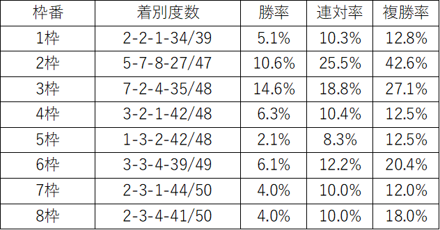2枠(複勝率42.6%)についてのみ統計的有意差が認められ、平均複勝率(20%)よりも好走する傾向が見られた。