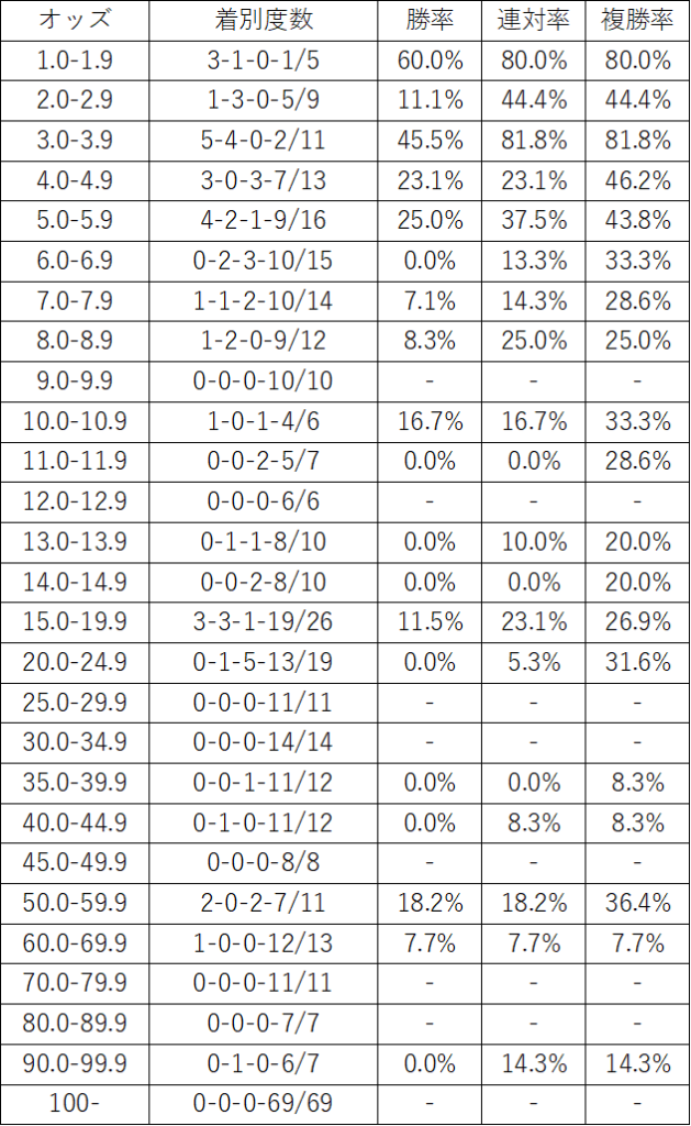 - オッズ1.0~1.9倍(複勝率80.0%)、2.0~2.9倍(複勝率44.4%)、3.0~3.9倍(複勝率81.8%)、4.0~4.9倍(複勝率46.2%)、5.0~5.9倍(複勝率43.8%)