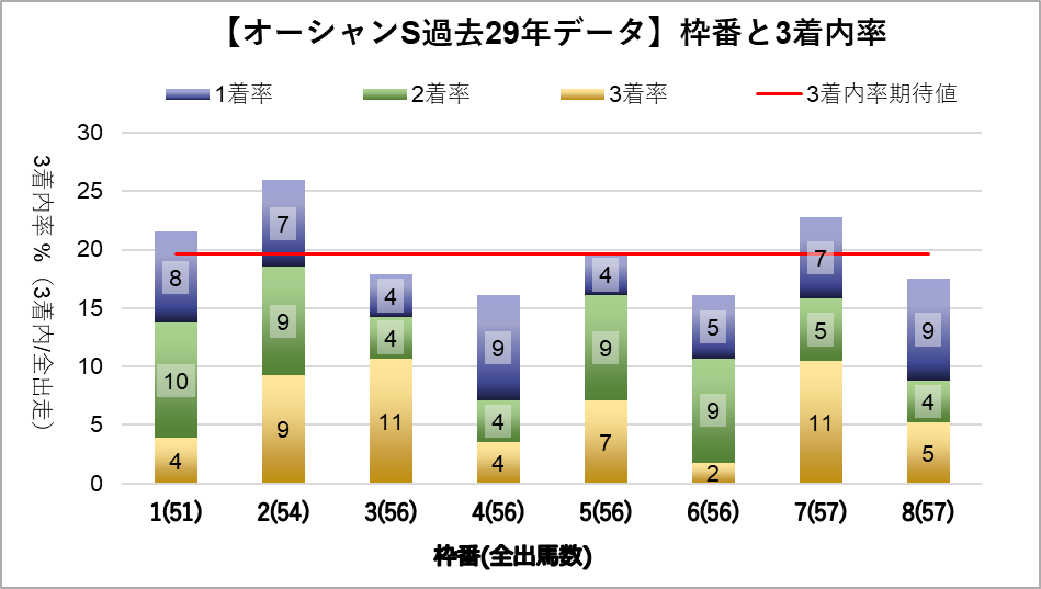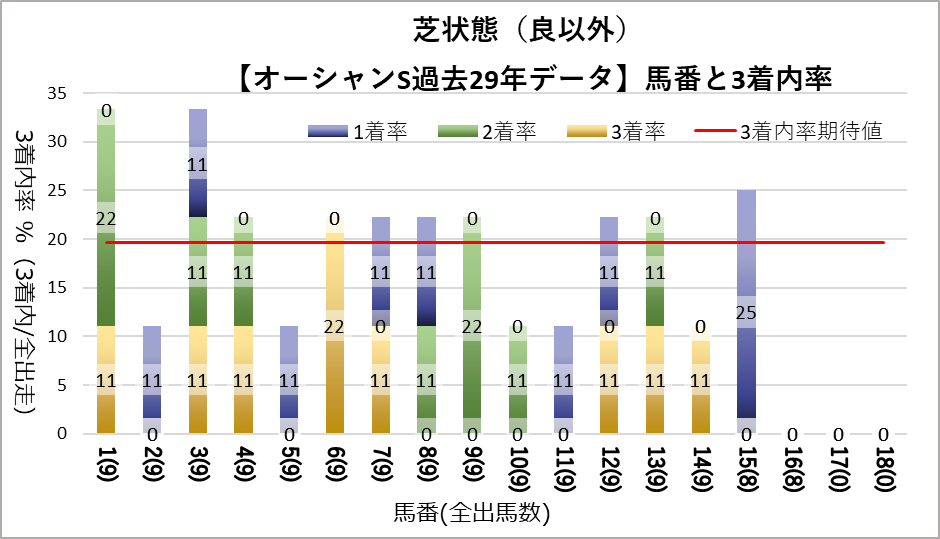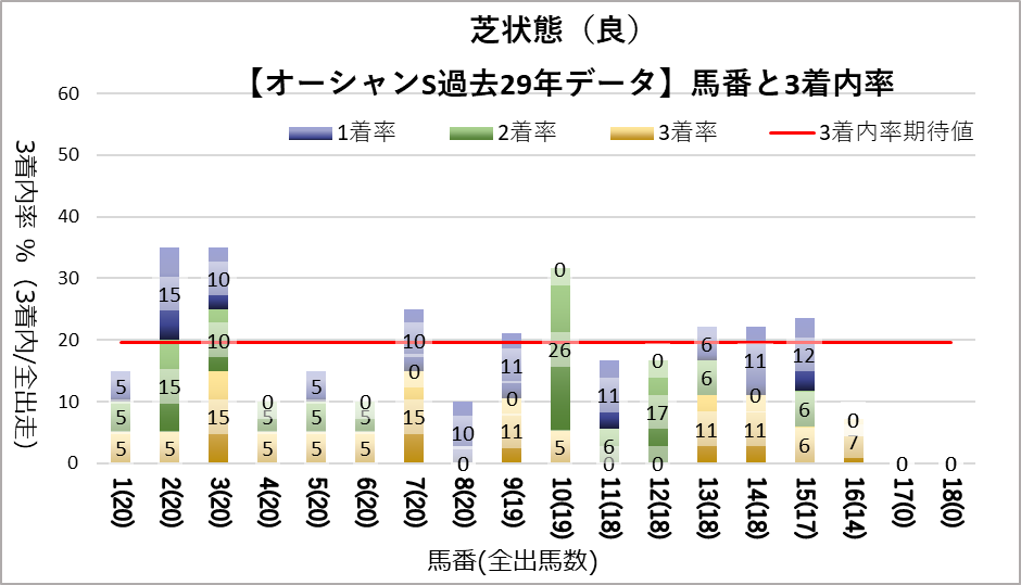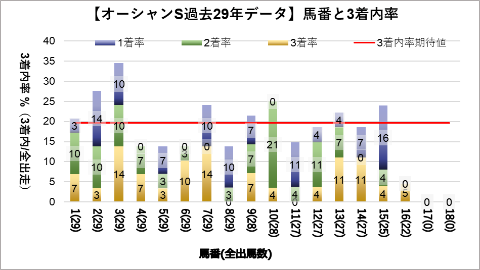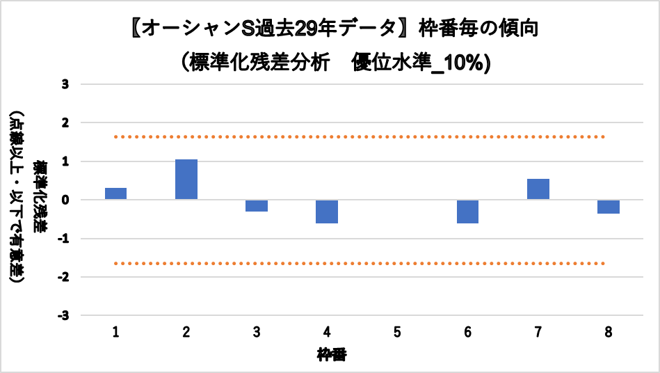 3番(複勝率34.5%)についてのみ統計的有意差が認められ、平均複勝率(20%)よりも好走する傾向が見られた。