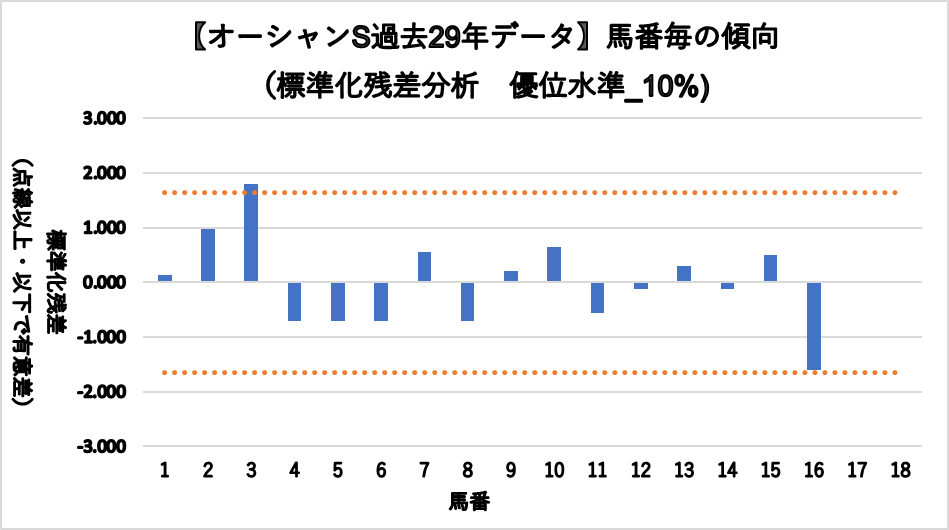 統計的に有意差があった項目について、3着内率グラフと統計処理(標準残差分析)グラフの2つを掲載しています。