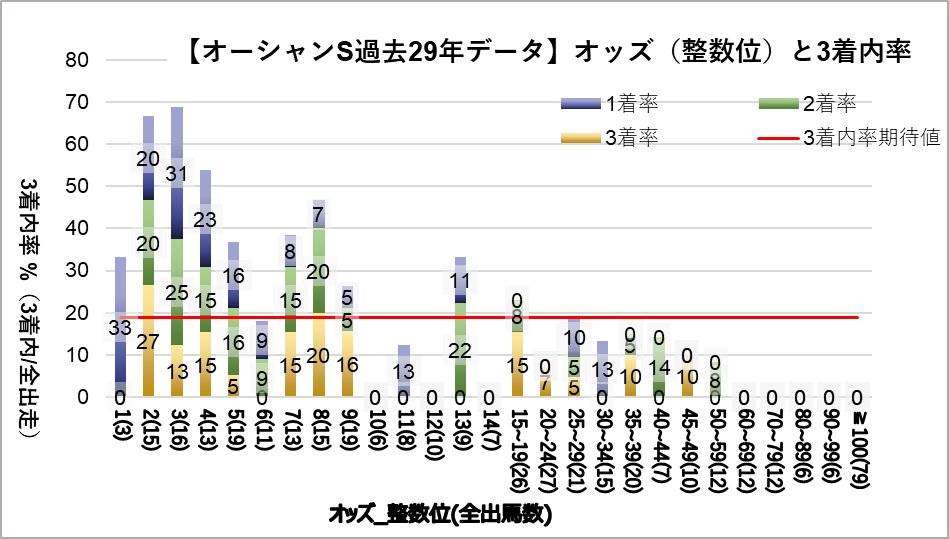 - 2.0~2.9倍(複勝率66.7%)、3.0~3.9倍(複勝率68.8%)、4.0~4.9倍(複勝率53.8%)、5.0~5.9倍(複勝率36.8%)、8.0~8.9倍(複勝率46.7%)