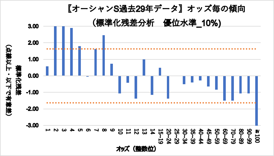 2.0~2.9倍(複勝率66.7%)、3.0~3.9倍(複勝率68.8%)、4.0~4.9倍(複勝率53.8%)、5.0~5.9倍(複勝率36.8%)、8.0~8.9倍(複勝率46.7%)これらのオッズ帯に統計的有意差が認められ、平均複勝率(20%)よりも好走する傾向が見られた。