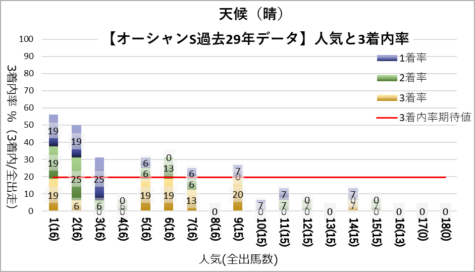 1人気(複勝率65.5%)、2人気(複勝率44.8%)、3人気(複勝率41.4%)これらの人気に統計的有意差が認められ、平均複勝率(20%)よりも好走する傾向が見られた。