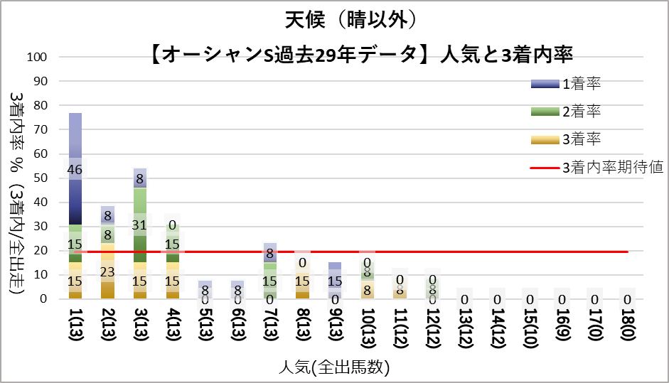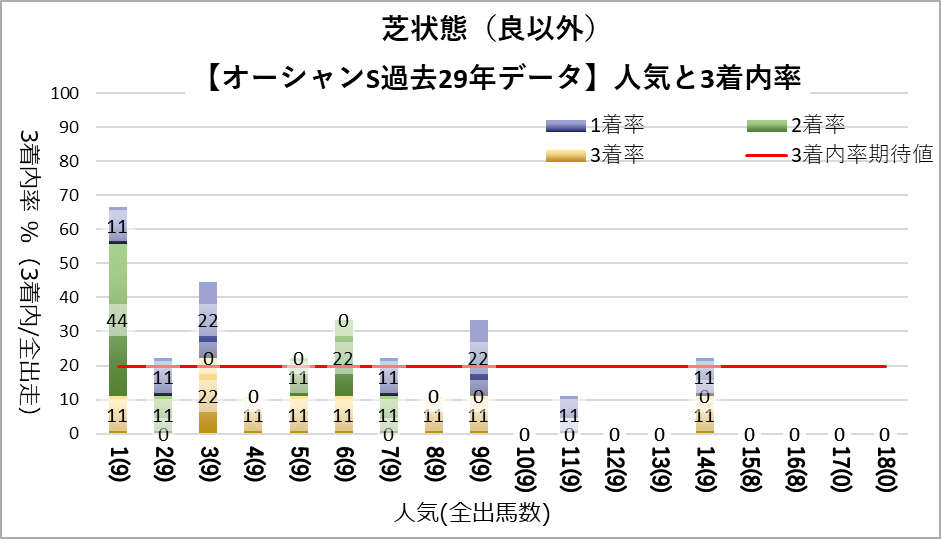 1人気は常に好走しているが、2人気については晴以外・良芝以外は平均程度の成績であることに注意が必要。
