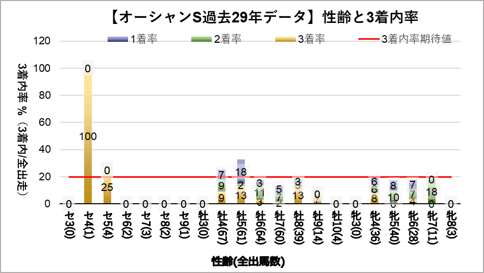 セン馬4歳(複勝率100%)※、牡馬5歳(複勝率32.8%)に統計的有意差が認められ、平均複勝率(20%)よりも好走する傾向が見られた。※出走数1回であることに注意