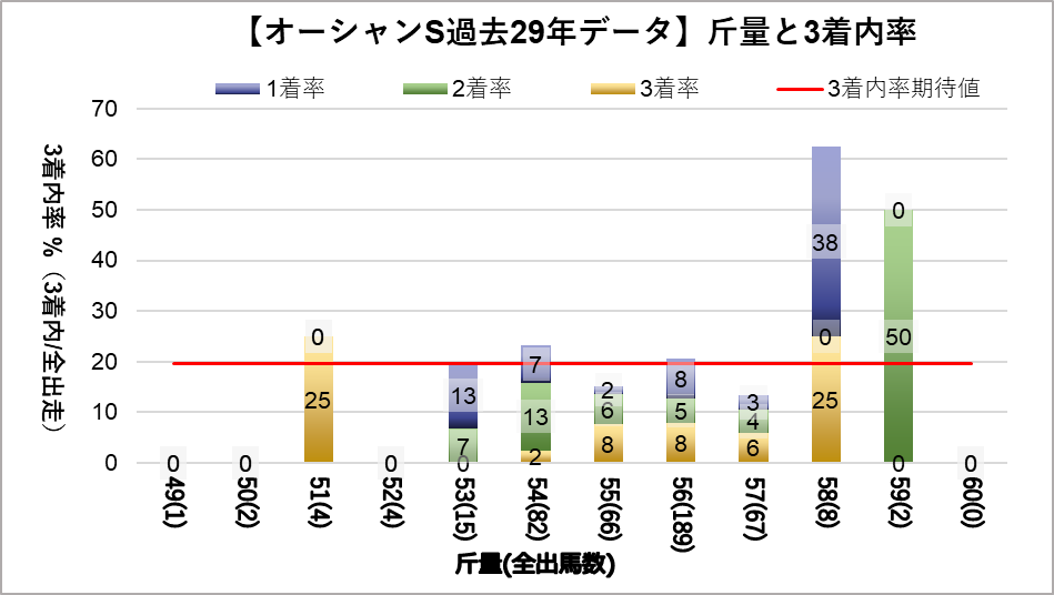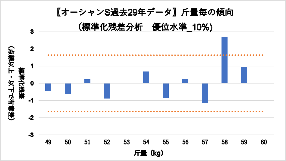 斤量58kg(複勝率62.5%)に統計的有意差が認められ、平均複勝率(20%)よりも好走する傾向が見られた。
