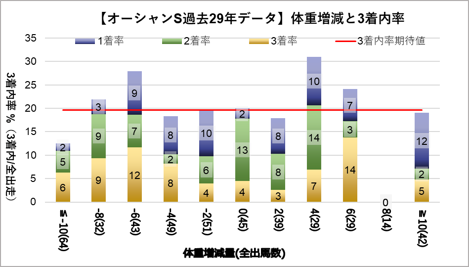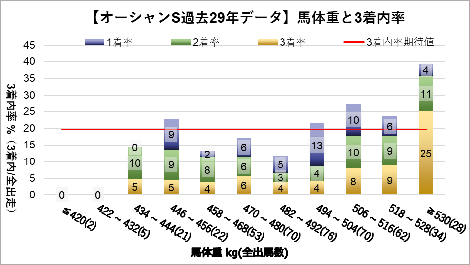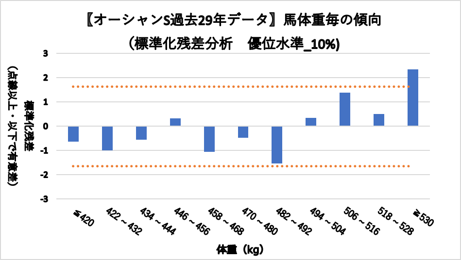 馬体重530kg以上(複勝率39.3%)において、統計的有意差が認められ、平均複勝率(20%)よりも好走する傾向が見られた
