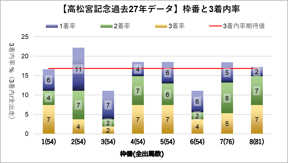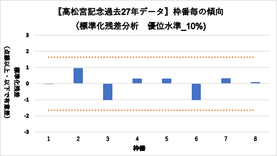 3, 6枠の凡走傾向がみられるものの、統計的に有意差は認められなかった。
