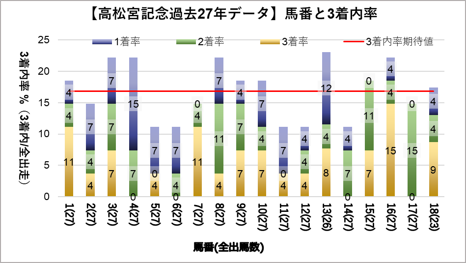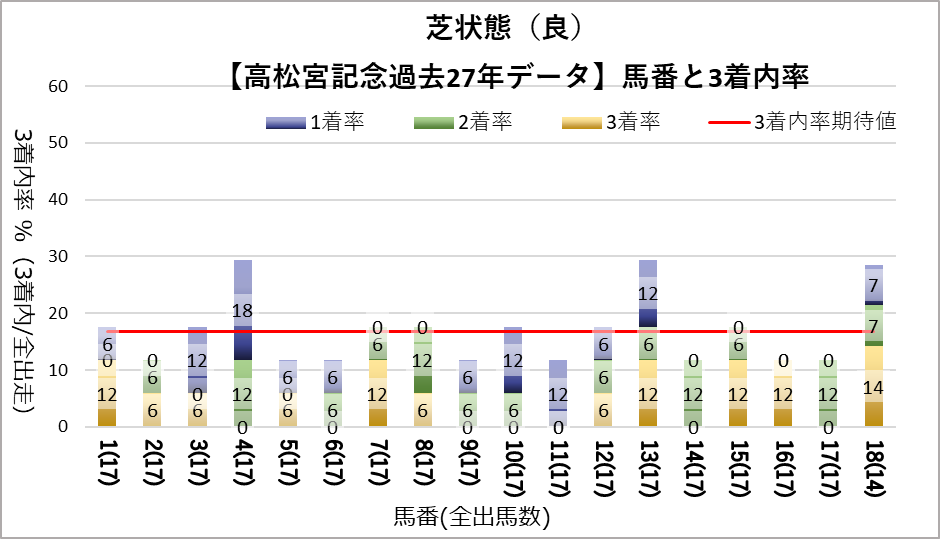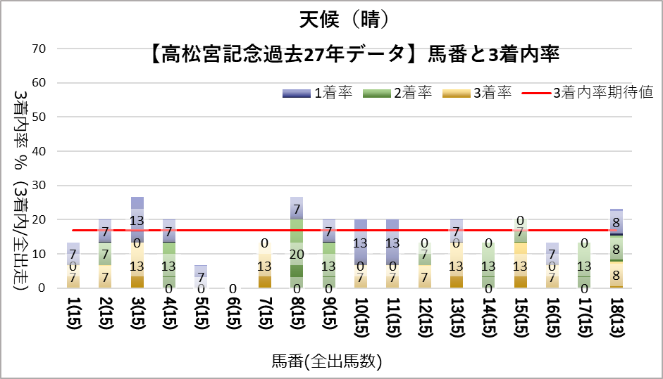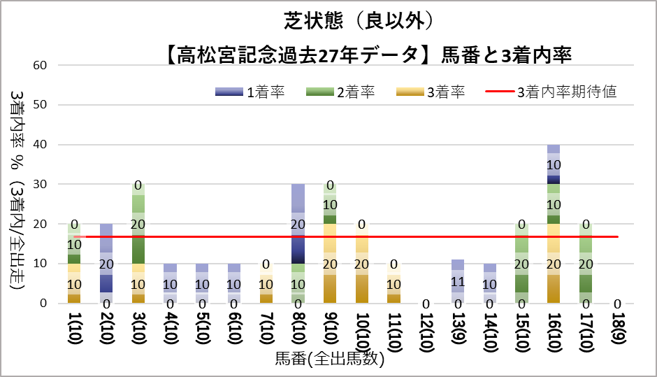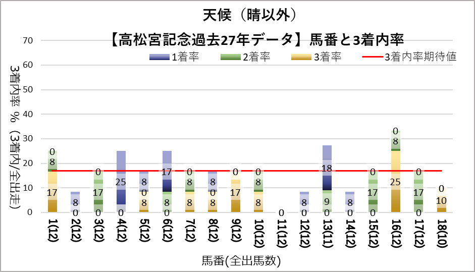 しかし、晴の時の6番、晴以外の時の11番、良芝以外の12番はそれぞれ出走回数が10回以上にもかかわらず、一度も馬券に絡んでいない。