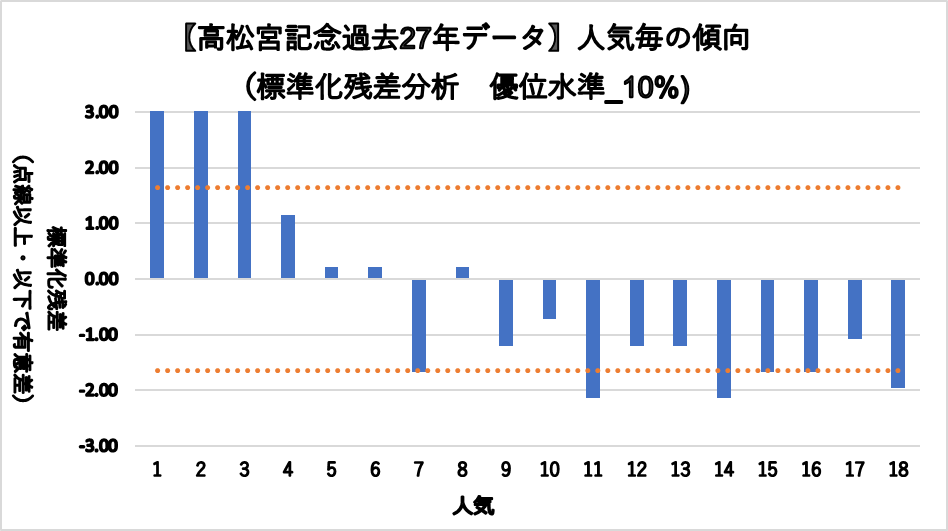 一方、7, 11, 14, 15, 16, 18人気においては有意に凡走する傾向が見られた。