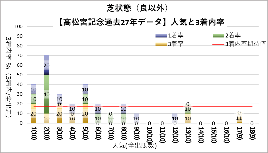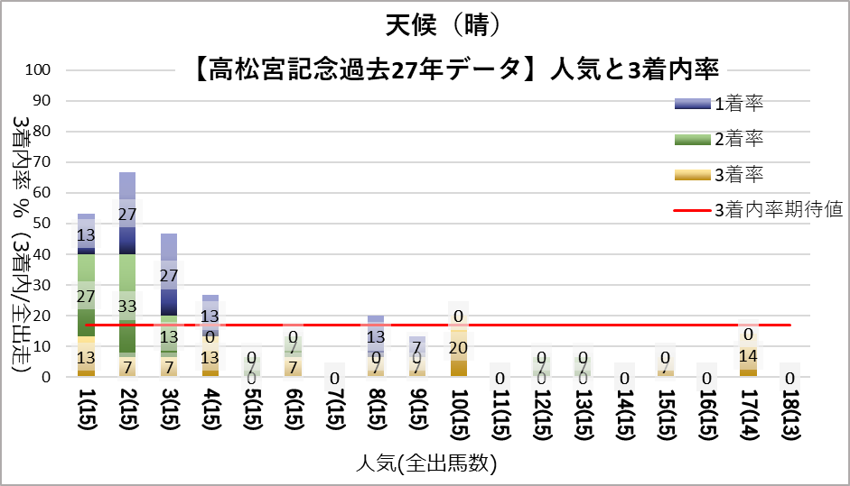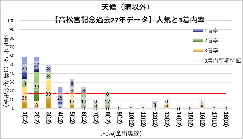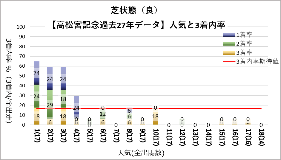 1人気(複勝率55.6%)、2人気(複勝率63.0%)、3人気(複勝率48.1%)これらの人気に統計的有意差が認められ、平均複勝率(17%)よりも好走する傾向が見られた。