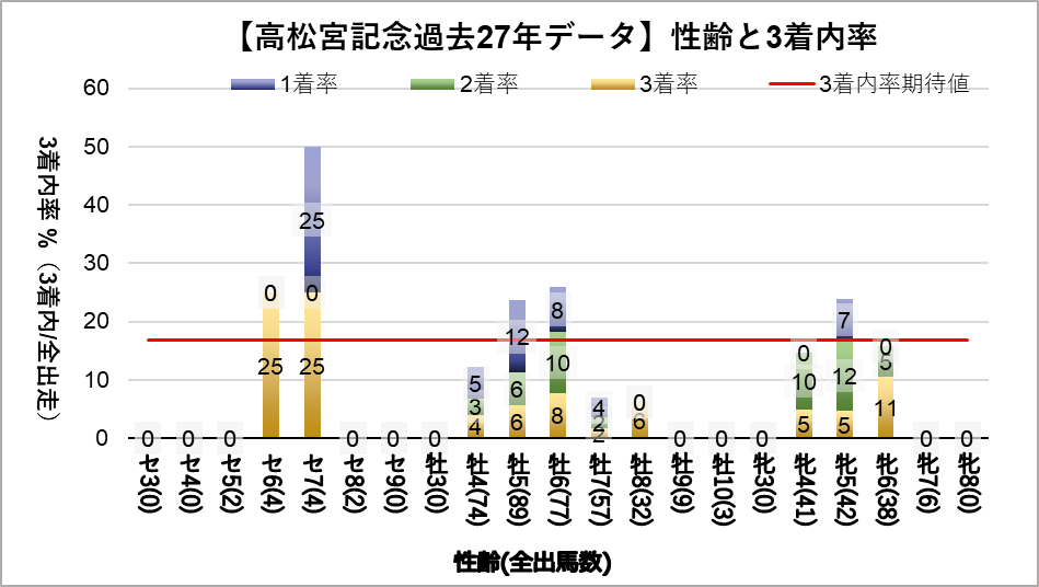 牡馬6歳(複勝率26.0%)に統計的有意差が認められ、平均複勝率(17%)よりも好走する傾向が見られた。